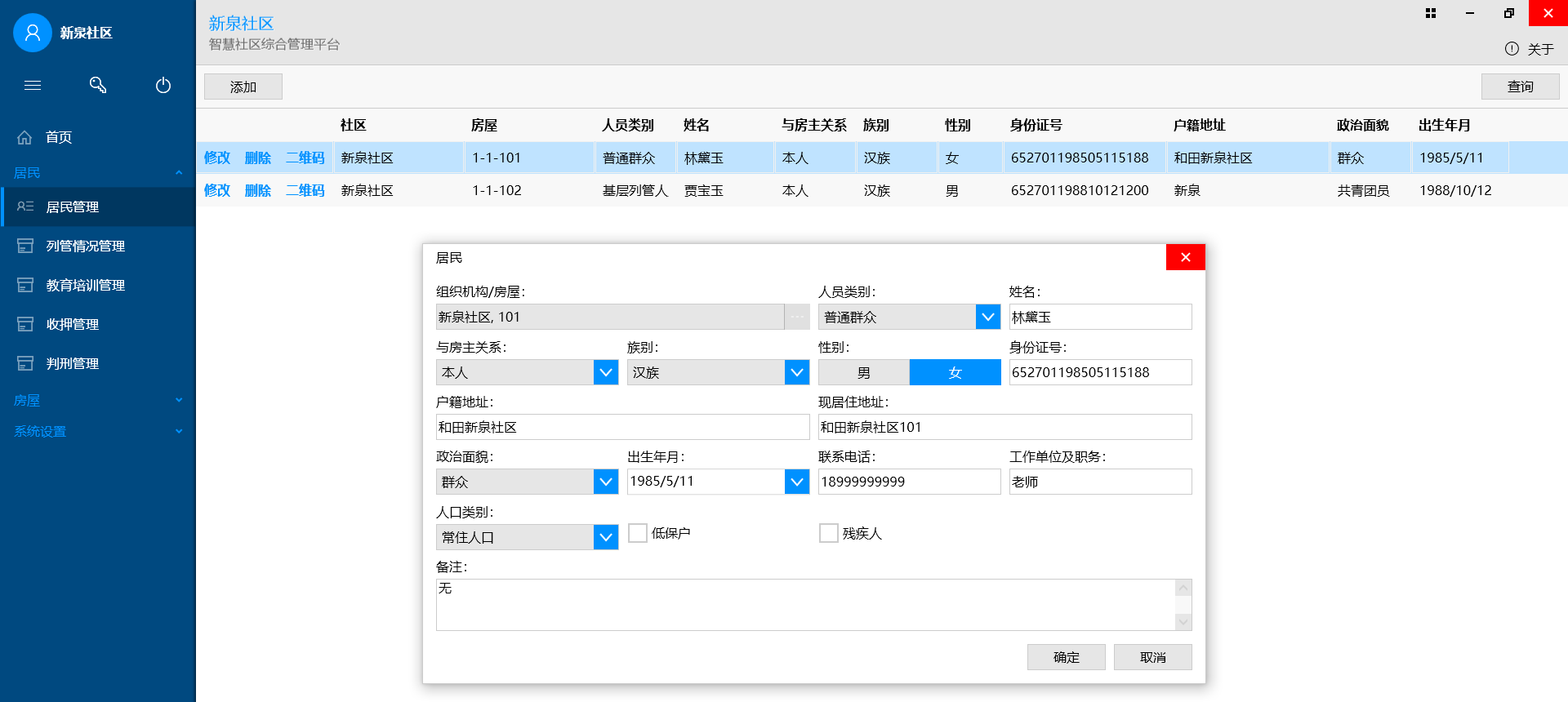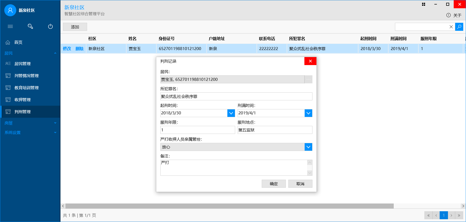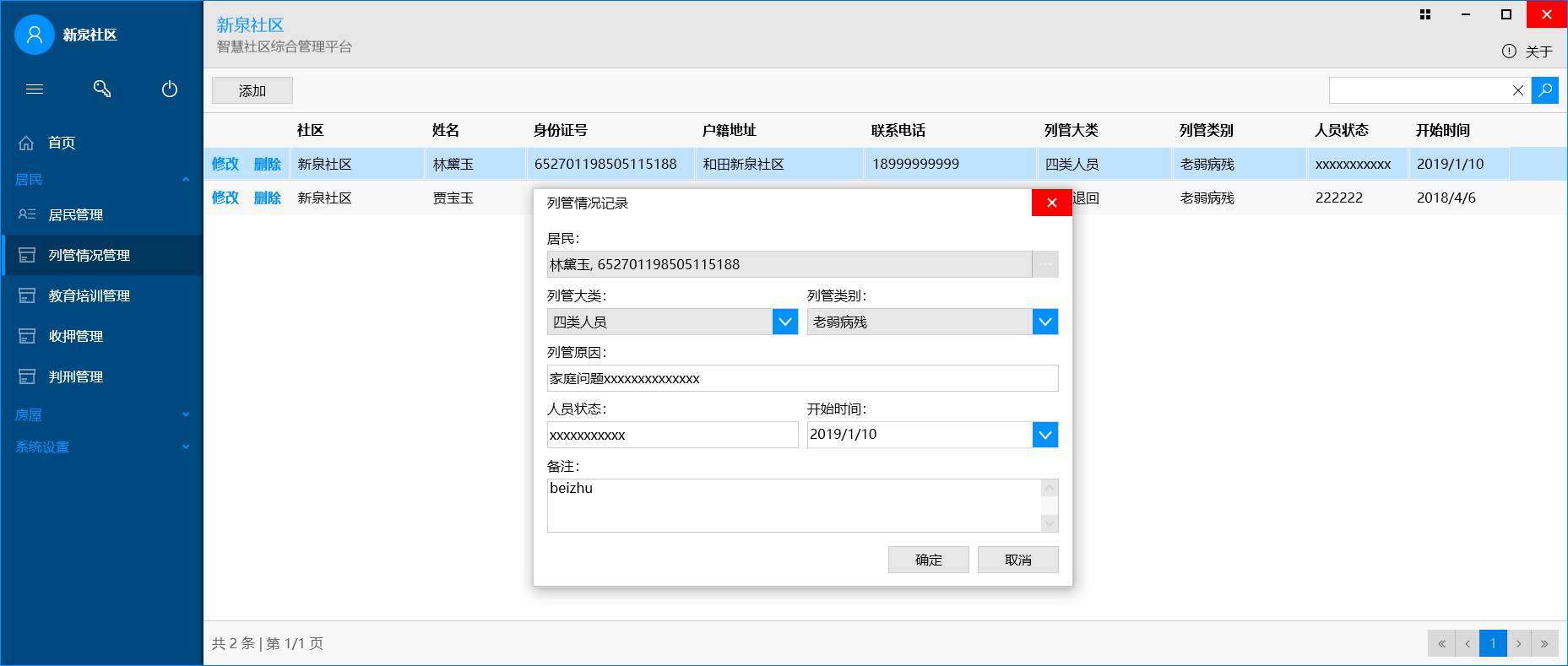 用于维护社区内房屋、居民的相关情况,居民包括:居民基本情况、列管、教育培训、收押、判刑情况等。C/S架构。